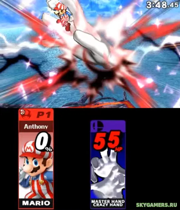 Знаменитые персонажи из известных игр Nintendo, а также персонажи-гости сойдутся в зрелищном файтинге на системе линейки Nintendo 3DS. Уникальные режимы, сетевая многопользовательская игра, возможность настраивать бойцов и самый крупный в серии список персонажей — Super Smash Bros. for Nintendo 3DS станет битвой века! Основы Super Smash Bros. просты. Используйте уникальные атаки и особые приемы выбранного персонажа, чтобы нанести урон сопернику, а затем отправьте его суперударом в полет с арены! Чем выше урон, полученный соперником (он представлен в процентах), тем дальше он улетит, так что отделайте его хорошенько, а потом используйте самый сильный суперудар и отправьте его прямо в небо! Сразитесь с соседями в локальном многопользовательском режиме или участвуйте в боях по Интернету и заявите о себе на весь мир. Мегамэн, Малыш Мэк, ПЭКМЕН и другие новые участники составляют длиннейший список знаменитых бойцов за всю историю Super Smash Bros. У вас даже будет возможность использовать образ этих персонажей в своем Mii. Станьте фехтовальщиком, стрелком или бойцом и проверьте себя в битве! Выбрав персонажа, настройте особые приемы и снаряжение по своему вкусу. Собирайте снаряжение в процессе игры и используйте его, чтобы идеально сбалансировать атаку, оборону и скорость или же развить до предела какой-нибудь один атрибут под свой стиль игры. Особые приемы тоже можно собирать и настраивать, что позволяет вам создать своего идеального бойца! Игры Super Smash Bros. for Wii U и Super Smash Bros. for Nintendo 3DS схожи одинаковым списком бойцов, предметами и основным геймплеем, но различаются уникальными режимами, созданными для разных форматов. На Nintendo 3DS вы можете вести поединок в режиме StreetPass-битва, где вы сражаетесь с персонажами, собранными через StreetPass. В Боевом походе сражайтесь с противниками в большом лабиринте, затем подготовьте своего бойца к финальной битве в уникальном режиме с боями, стратегией и абсолютно захватывающим геймплеем! Кроме того, эта игра является самой первой игрой Super Smash Bros., в которую вы можете играть в пути. Она великолепно подходит для покорения любых врагов, независимо от места и времени!