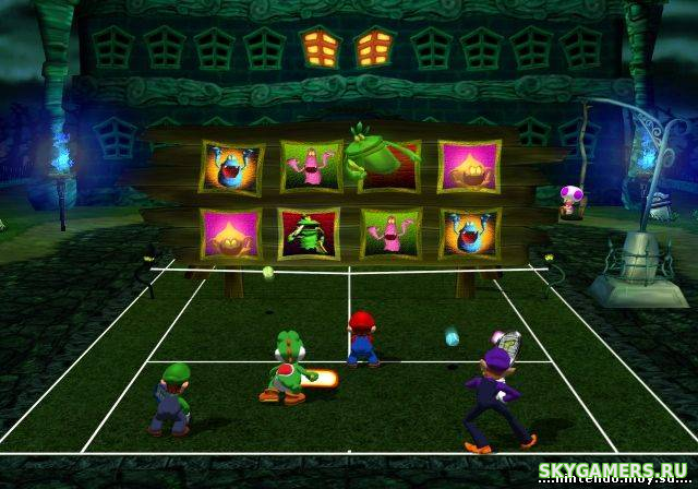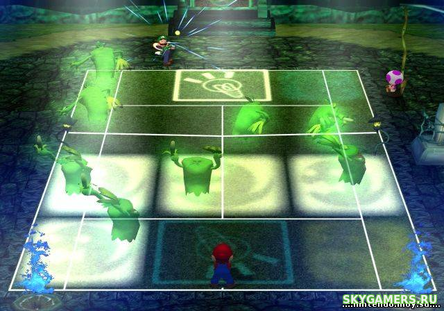 Mario Power Tennis - аркадный спортивный симулятор со множеством игровых персонажей и локаций. Игрок может выбрать любого из 14 героев и использовать его в любом из возможных режимов, включая Одиночную игру, Турнир или Специальную игру. Одиночная игра - это игра в теннис по стандартным правилам: либо один на один, либо два на два. В Турнире вы можете выбрать одного из персонажей и попытаться завоевать первое место в соревновании с постоянно увеличивающейся сложностью. Играть в турнире также можно как один на один, так и два на два. Во время турнира вы можете открывать новые мини-игры и даже поучаствовать в Турнире Всех Звезд. А в режиме Специальной игры вы можете попробовать свои силы в различных мини-играх. Например, попытаться раскрасить картинку, отбивая ракеткой шарики с краской. Одна из главных особенностей Mario Power Tennis - это то, что у каждого игрового персонажа есть два специальных движения: одно для защиты и другое для атаки. Это позволяет игроку, например, сделать безумно сильную подачу или отбить мяч, даже если он на другом конце корта. Однако в режиме одиночной игры эти специальные движения можно вовсе выключить. В игре есть несколько уникальных кортов, каждый со своими особенностями. Скажем, на корте около дома Луиджи вокруг площадки появляются и исчезают призраки, сильно отвлекающие игроков.
